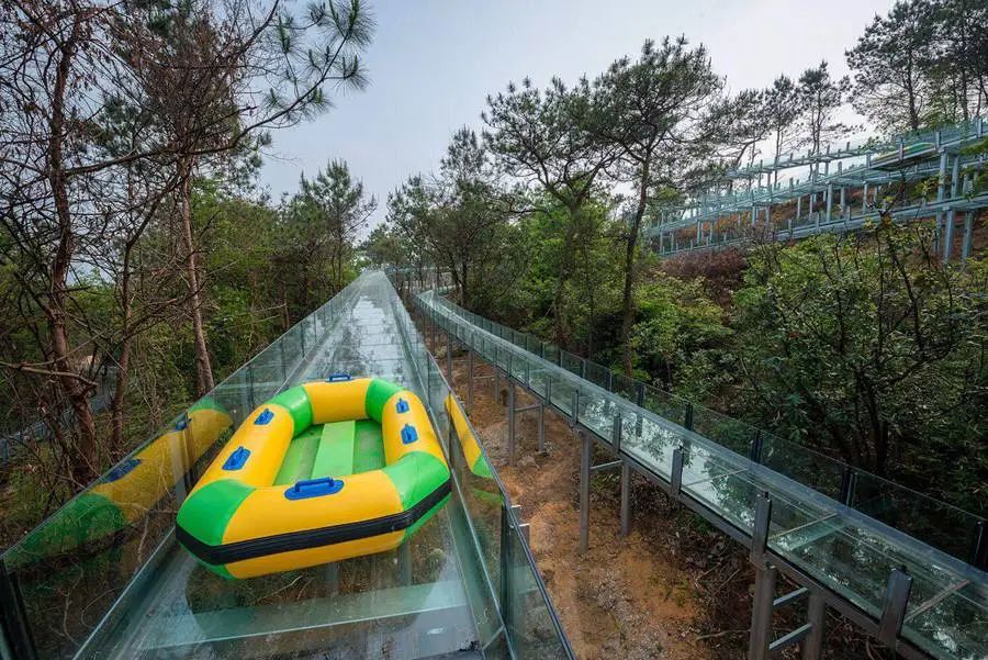 空中漂流由钢化玻璃、钢柱及钢筋支架组成的,全程两条玻璃栈道组成近3000米。栈道依山势而建,像两条猛龙盘旋在郁郁葱葱的大帽山之中。