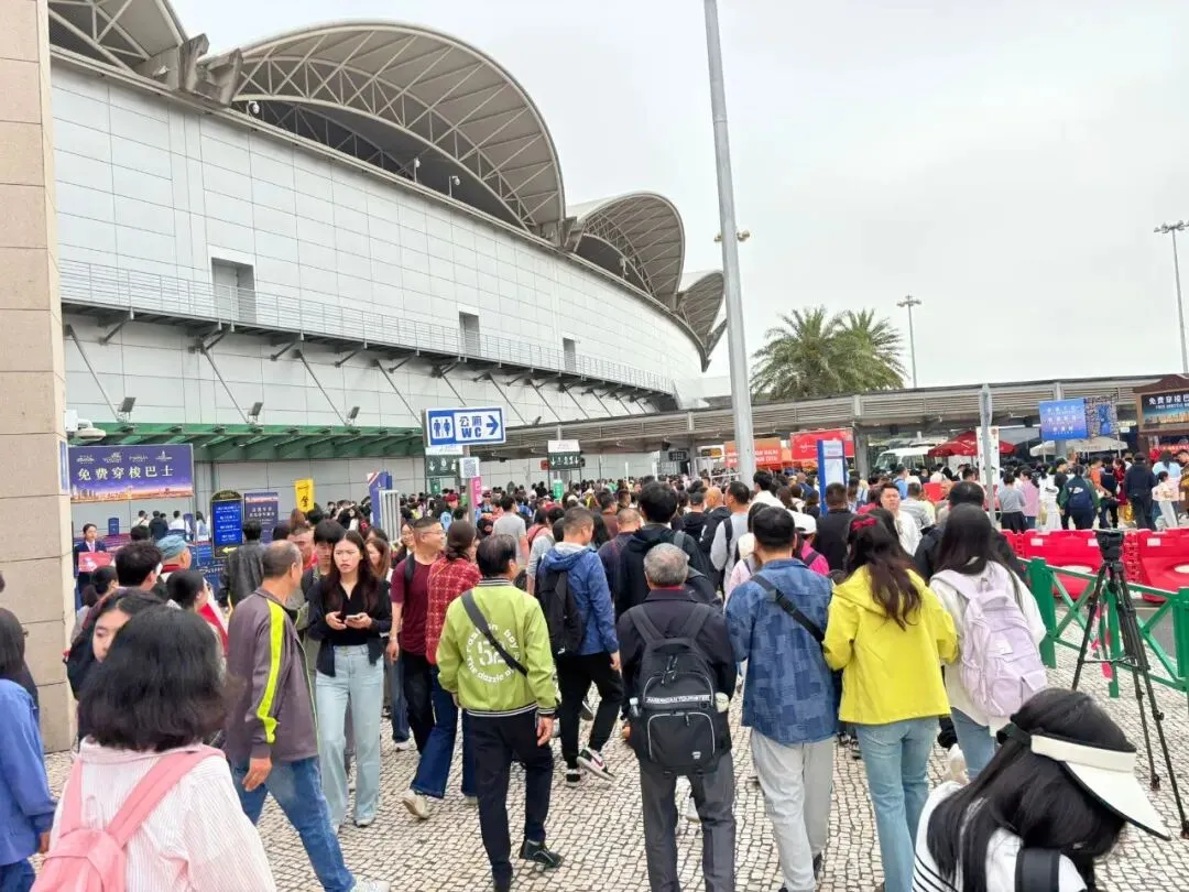 昨日早上不少旅客陸續經關閘口岸訪澳,關閘入境大堂及廣場的人流明顯增多,發財巴候客區一度排起長龍,有警員及工作人員在場協助疏導人流,秩序良好。