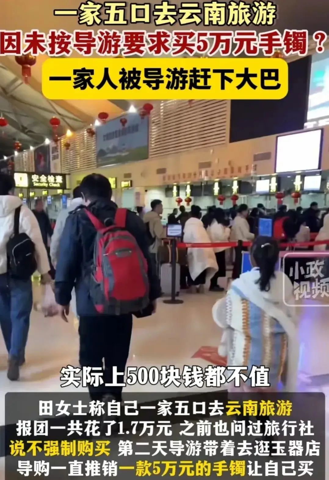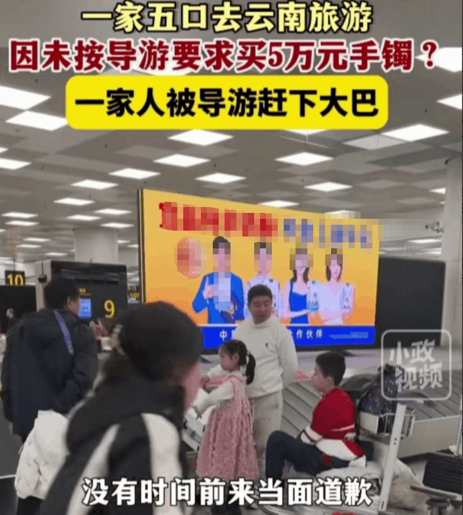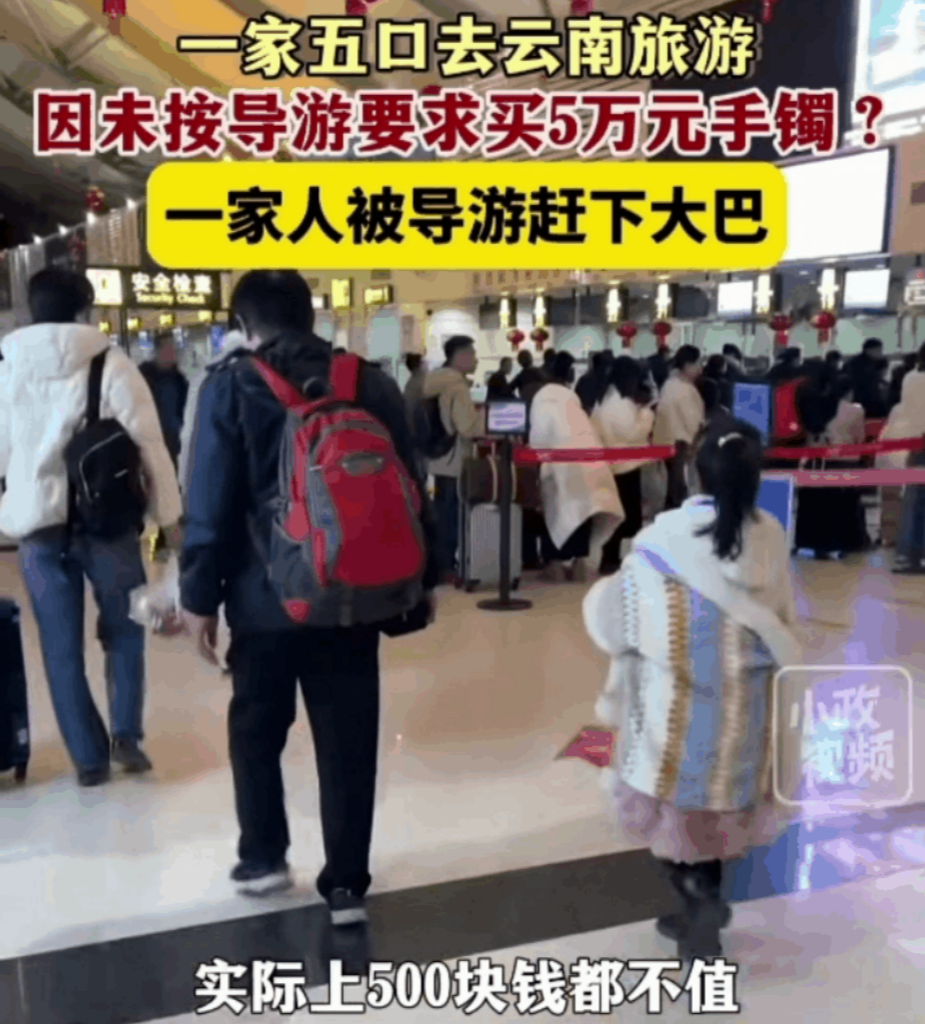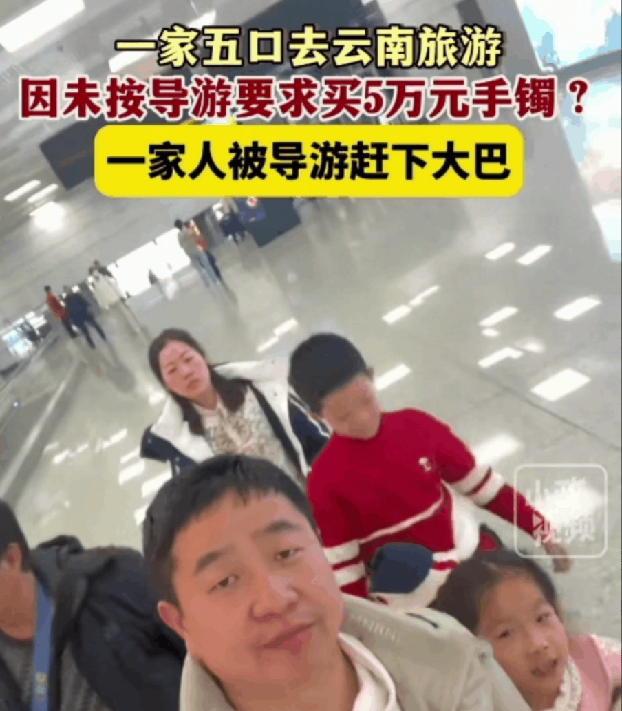 2月16日,据小政视频报道:“有游客称,自己一家五口去云南旅游,由于未按导游的要求购买5万元的镯子?一家五口被导游赶下大巴车!”此视频一经发布瞬间引起网友广泛热议。