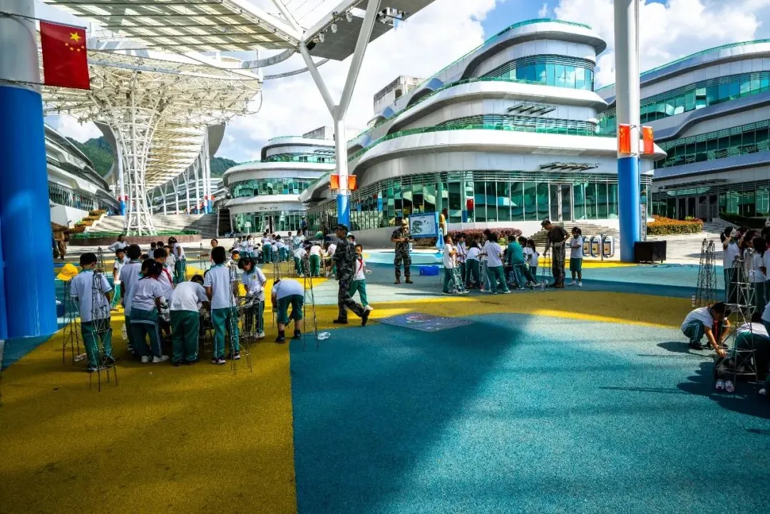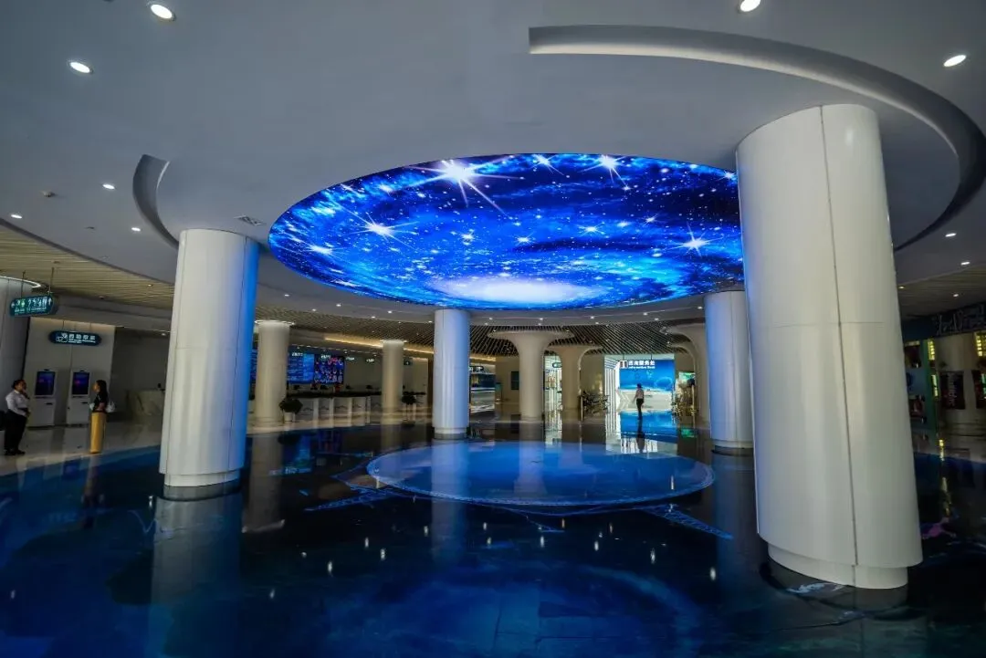游客中心离时空塔不远,内部装饰以蓝色为基调,宛若一座蓝宝石般的宫殿。通往游览车站需经过一条长长的走廊,两侧是介绍空间科技的展馆,头顶由玻璃钢架覆盖。行走其间,恍若穿越一条光影隧道。一群小朋友正在走廊上接受科普教育,童趣盎然。