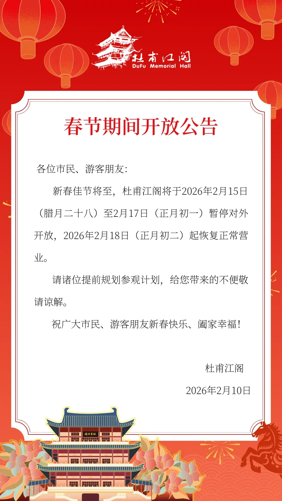 1、春节开放时间:2026年春节假期(2月15日—2月23日),本馆所辖各景点均正常对外开放,包括毛泽东同志故居、韶山毛泽东同志纪念馆(生平展区)、韶山毛泽东同志纪念馆(专题展区)、南岸私塾、毛氏宗祠。其中毛泽东同志故居、生平展区、专题展区需要免费实名预约。在此期间,生平展区的闭馆日(每周一)顺延至2月24日。详情可见公告截图: