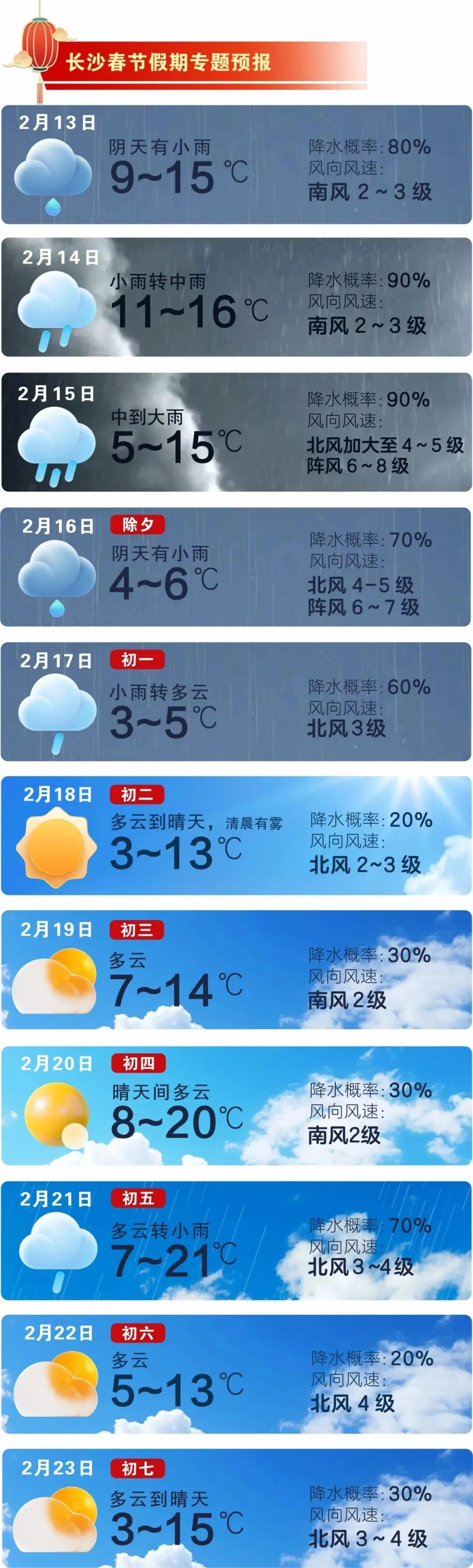 春节期间长沙可能有雨,温差较大,外地来长沙的朋友请一定注意要防寒保暖。长沙春节期间天气预报请参考: