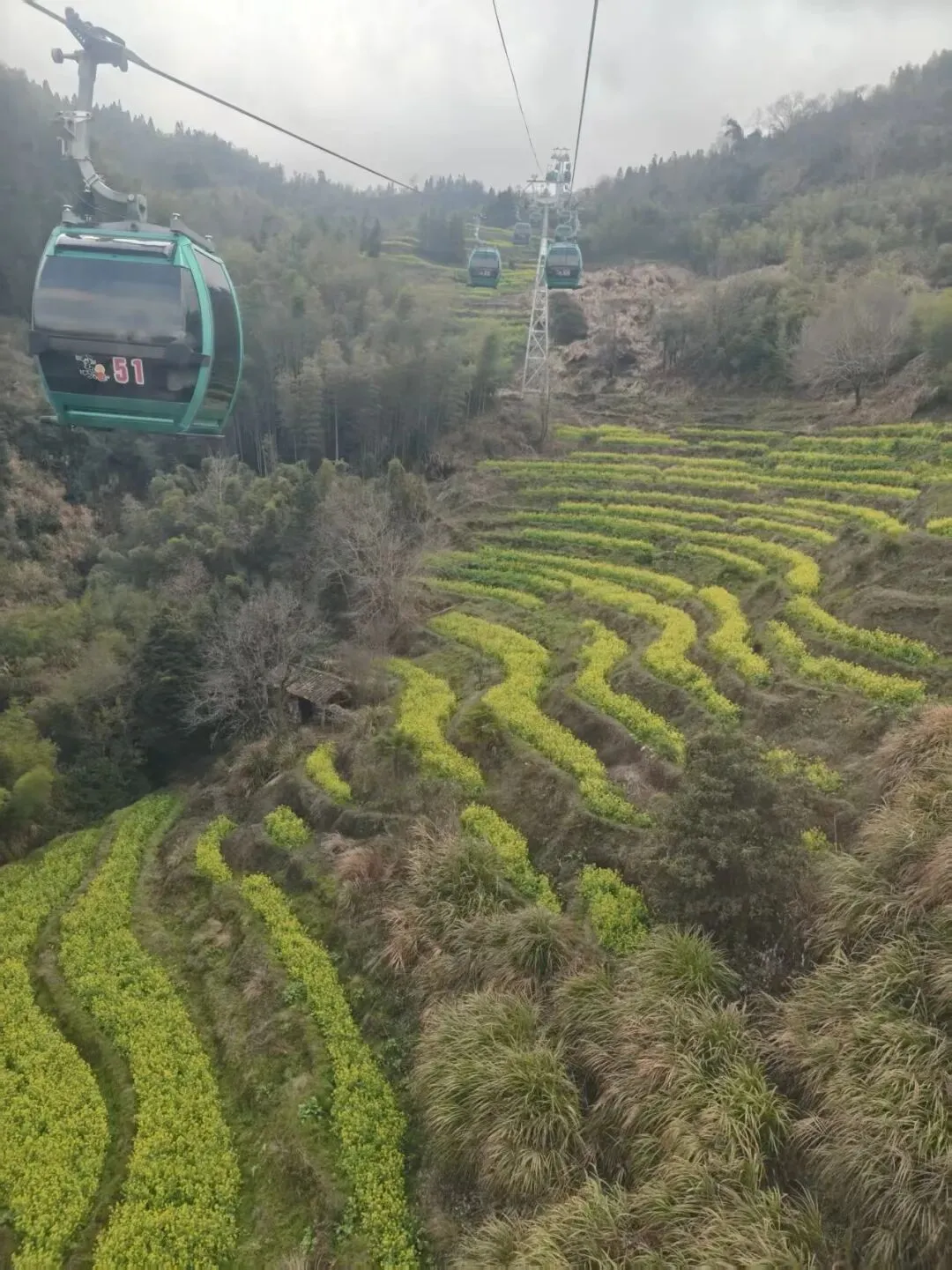 去篁岭景区,必须坐索道。坐在索道上,山头近在咫尺,往下看,月亮弯似的梯田一道一道的,逐渐向上蜿蜒。梯田里的油菜花金黄金黄,像给山坡穿上一件带条纹的花衣服。