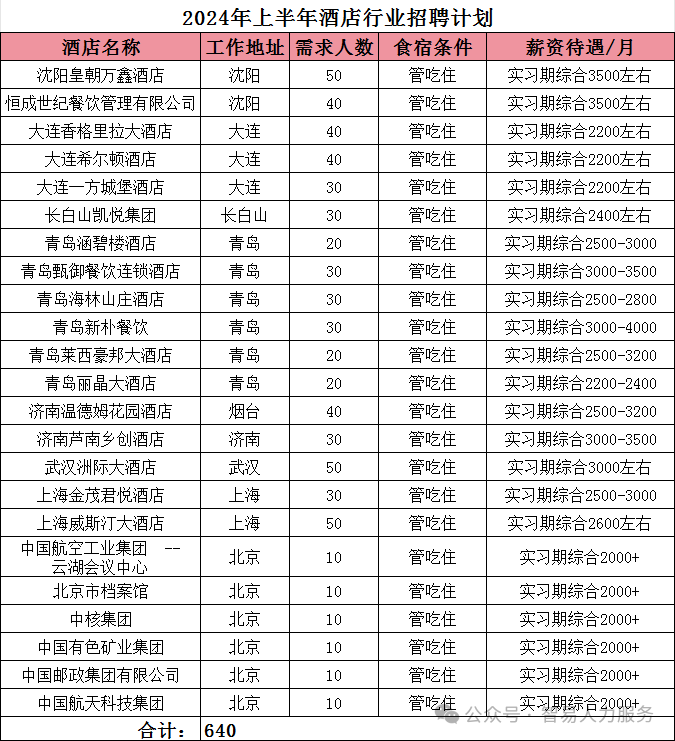 在众多合作院校酒店管理、烹饪、旅游管理、空乘等专业实习生的翘首企盼中,我们甄选了若干全国各地的星级酒店及企事业单位,挑选薪资合理、福利待遇优厚的二十余家,在2024年上半年为大家安排实习和就业。
