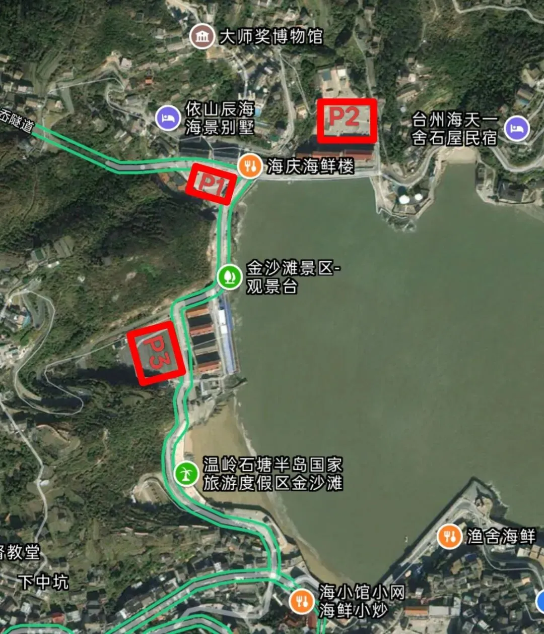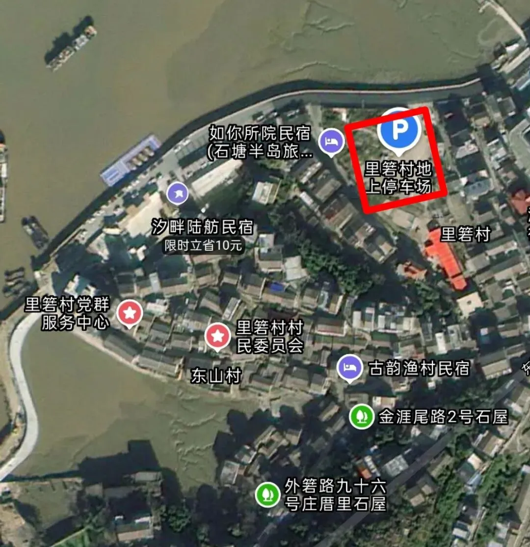 1号停车场:石塘镇人民政府西侧约50米,距离里箬村陈和隆旧宅约3.5公里,距离金沙滩景区约2公里。