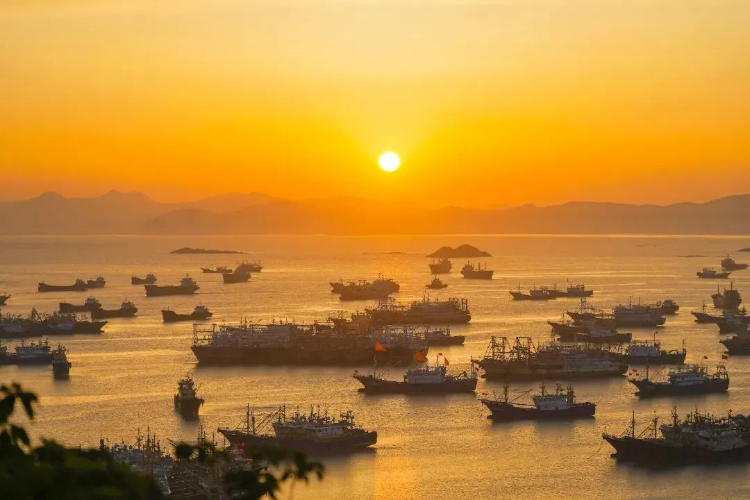 日落时分,夕阳余晖倾洒在繁忙的海面,波光粼粼。金色光辉与渔港色彩相互辉映,恰似一幅绝美的油画。海风轻拂,渔船静泊港内,天边云霞似绚烂织锦,如梦似幻,令人沉醉不已。