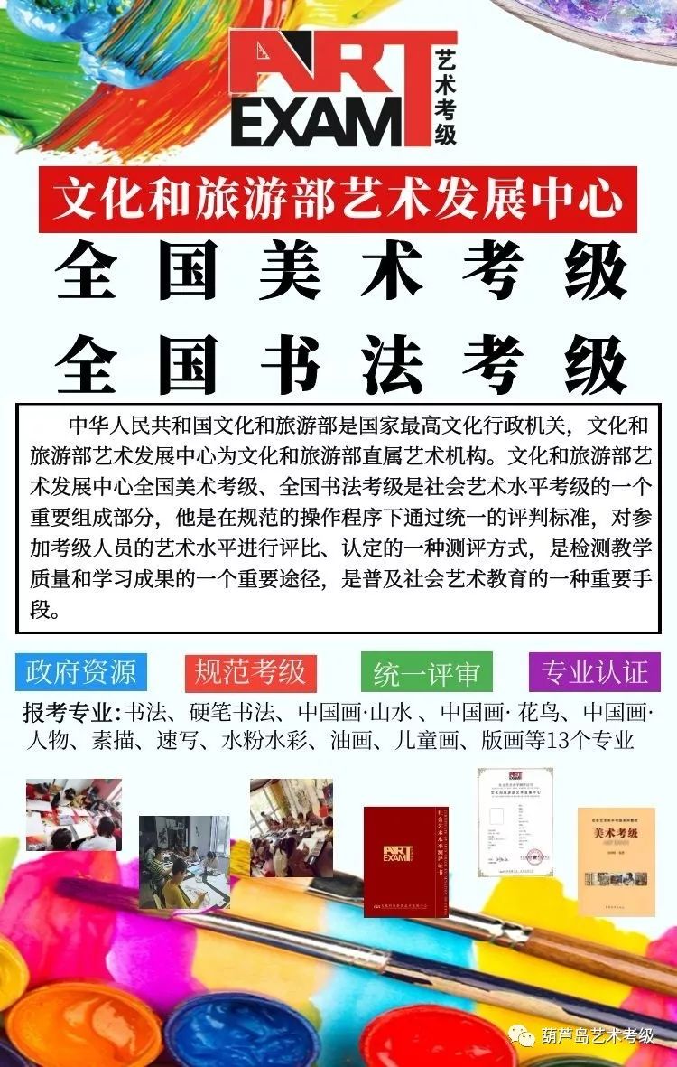 中华人民共和国文化和旅游部是国务院组成部委之一,是国家最高文化行政机关,文化部艺术发展中心为文化和旅游部直属单位。文化和旅游部是“全国社会艺术水平考级”的审批、监督管理单位,文化部艺术发展中心全国美术、书法考级代表着中国美术、书法考级的最高水平。