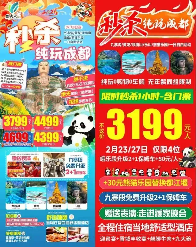 【肇东纵横旅游年后团】2月23/27日秒杀纯玩成都特价8日游 最低秒杀价格