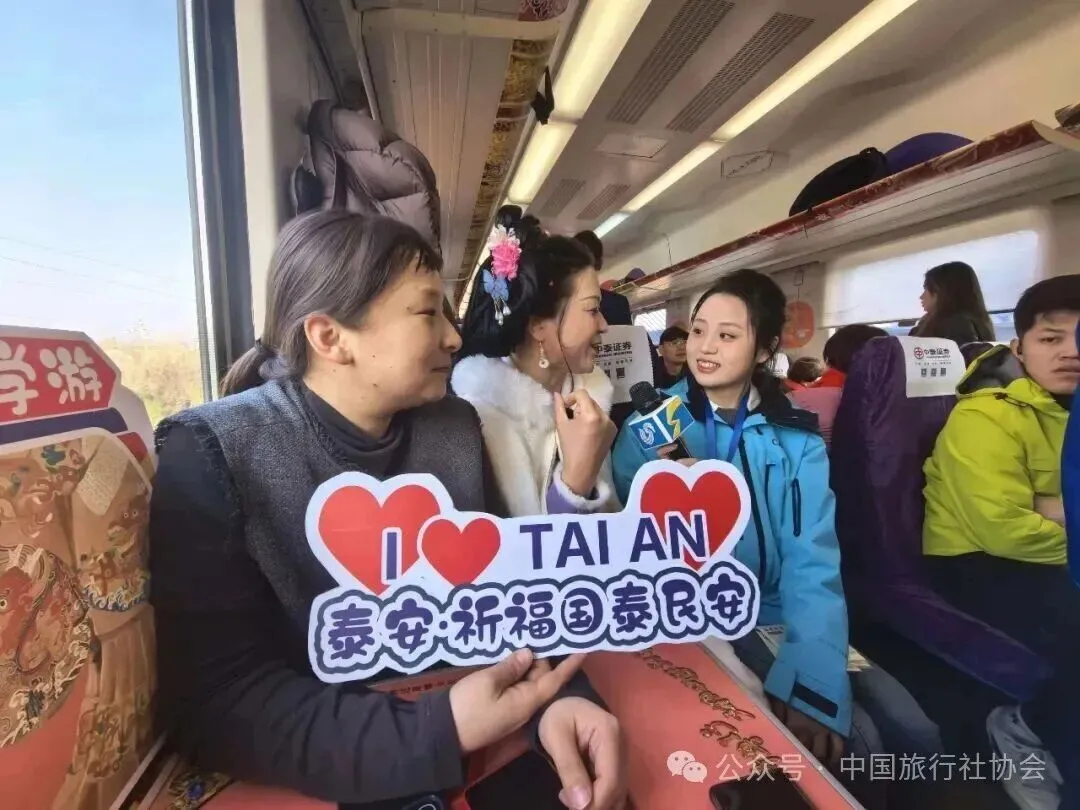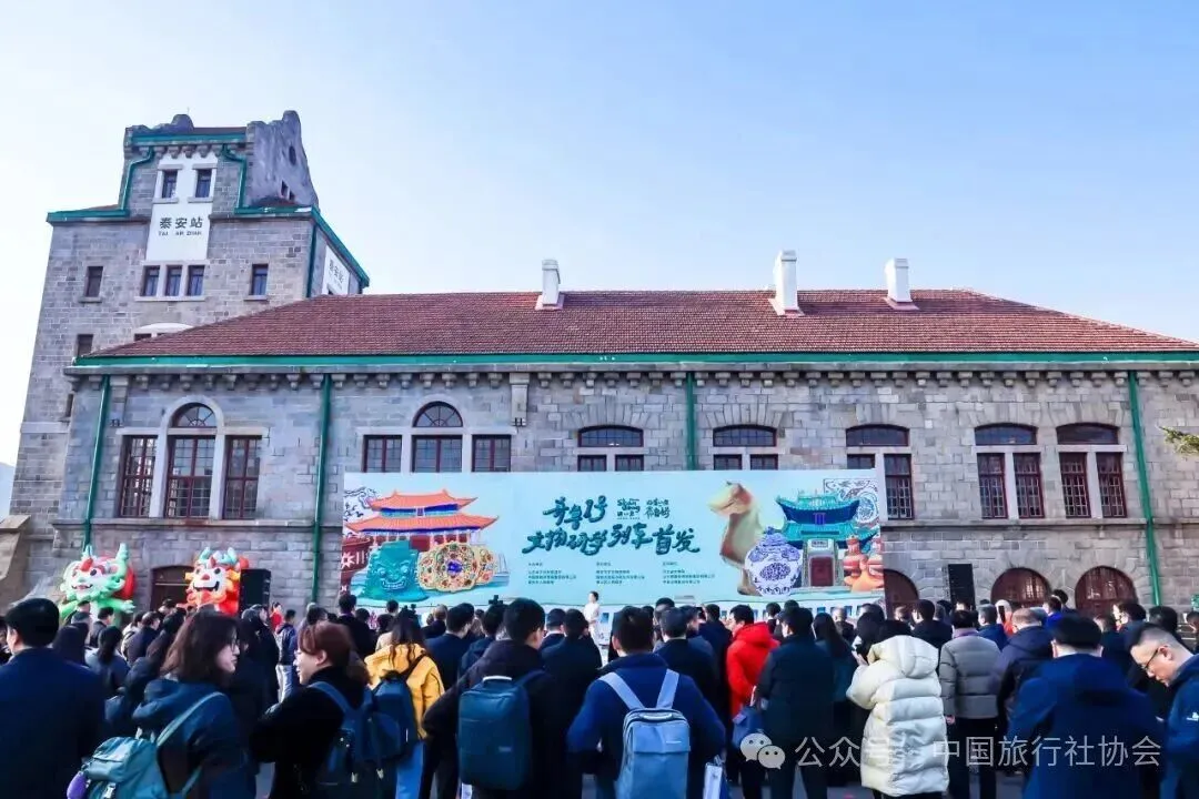 2月14日上午,“好客山东·齐鲁1号”文物研学主题旅游列车首发活动在泰安举行,这是“好客山东·齐鲁1号”品牌体系下的首个跨省文物研学主题旅游列车。