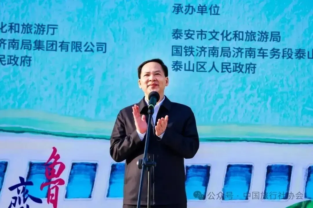 副省长温暖出席活动并宣布列车启动,山东省文化和旅游厅厅长、省文物局局长喻剑南,泰安市委副书记、市长李国强,中国铁路济南局集团有限公司总经理刘再民,河北省文物局总工程师孙晶昌等出席活动并致辞。山东省旅行社协会会长王延辉携全省百余家旅行社从业者全程参与,以行业力量助力活动顺利开展。