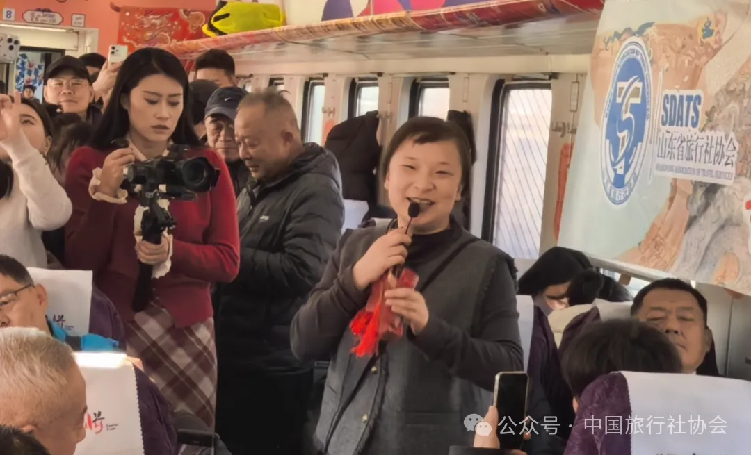 首发活动现场,山东省旅行社协会还精心策划了特色文艺展演环节,特邀高荣耀、秦桂香、白洪娟、张孟儒四位民间文化爱好者,先后呈现了《在列车上》吕剧《小姑仙》选段、《话山东》及《月亮没来》等精彩节目。演员们的倾情演绎,将齐鲁文化特色与研学主题巧妙融合,赢得了现场嘉宾、游客及从业者的广泛好评,为首发活动增添了浓厚的文化氛围。