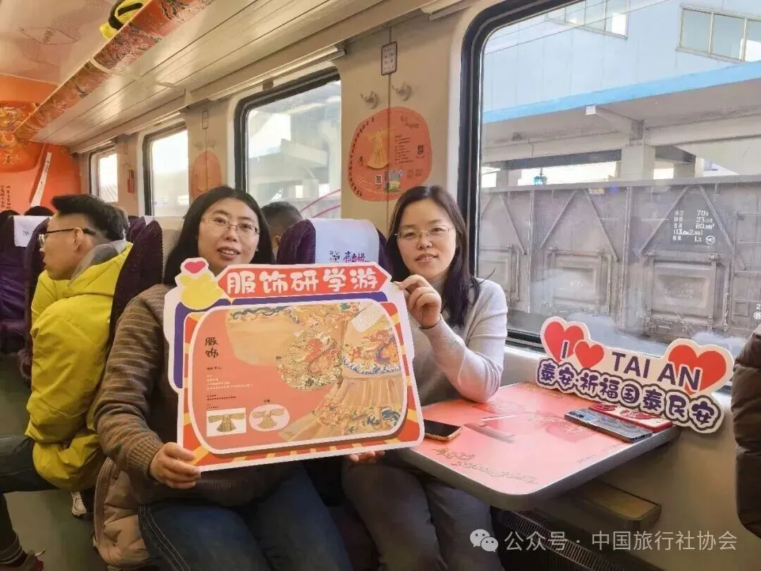 本次开行的旅游列车贯通山东、河北两省,串联泰安、济南、聊城、邯郸4座国家历史文化名城。列车以文物元素为设计核心,设置青铜、玉、瓷、陶、画像石、建筑、服饰七大主题车厢和1节综合娱乐车厢,打造集知识传播、互动体验、线下联动于一体的移动文化空间,将“铁轨上的移动博物馆”搬进旅途,让游客在乘车过程中沉浸式感受齐鲁与燕赵文化交融的魅力,推动“坐着火车去研学”成为文旅新时尚。同时,整合沿线11家博物馆的文博资源,联动63家A级景区、58家星级饭店及民宿,推出200余项免票、折扣优惠;山东省旅行社协会携手15家研学基地,打造“文物研学”“齐鲁文化寻踪”等特色产品,实现鲁冀豫津多地客源互送、产品共建。