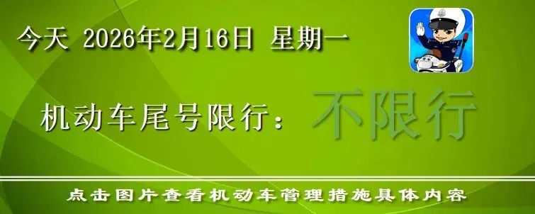 大年初五(21日) 冷空气到访 给我市带来北风4-5级 受其影响 大年初六(22日) 气温下降 市区气温在8~-2℃之间 请您随时关注天气变化 做好假期安排 (以上内容来源:天津气象) Part 02 尾号限行提示 今天2月16日(星期一),春节假期第二天,机动车尾号不限行,本市区域号牌和外埠号牌小客车高峰不限行。