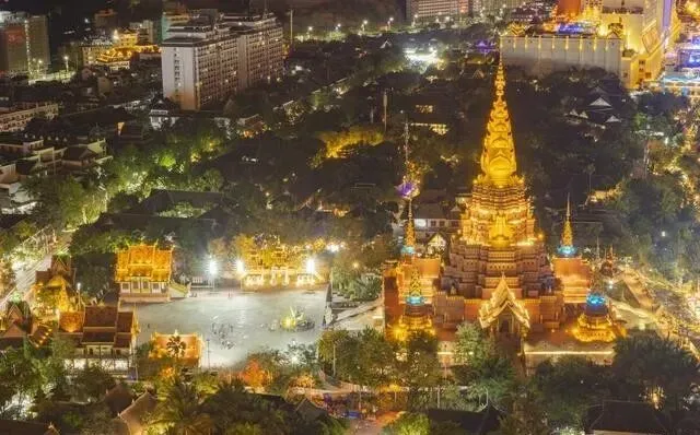 出站十分钟就到景洪市区了 , 澜沧江一边是老城 , 另一边是告庄 , 佛寺、椰树、菠萝蜜行道树、傣族村寨、各种金塔...你想要的异域感 , 这座边疆小城全都有