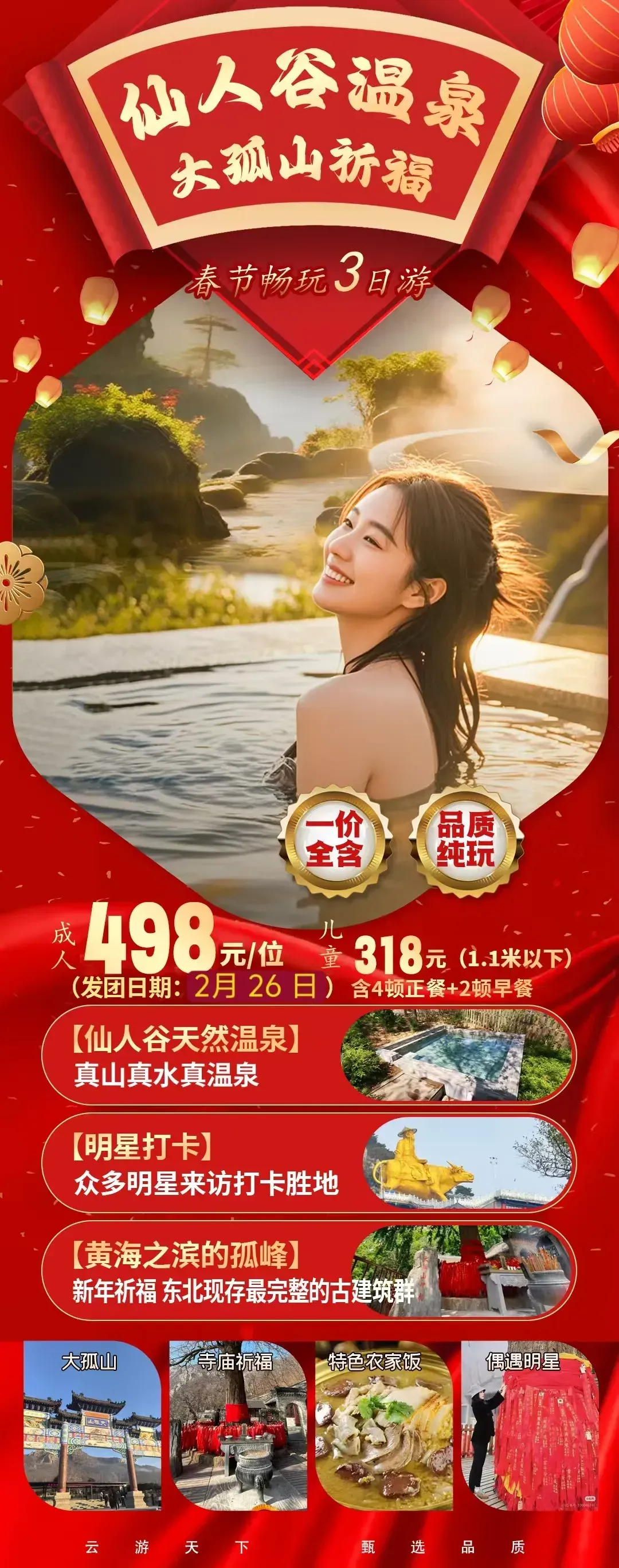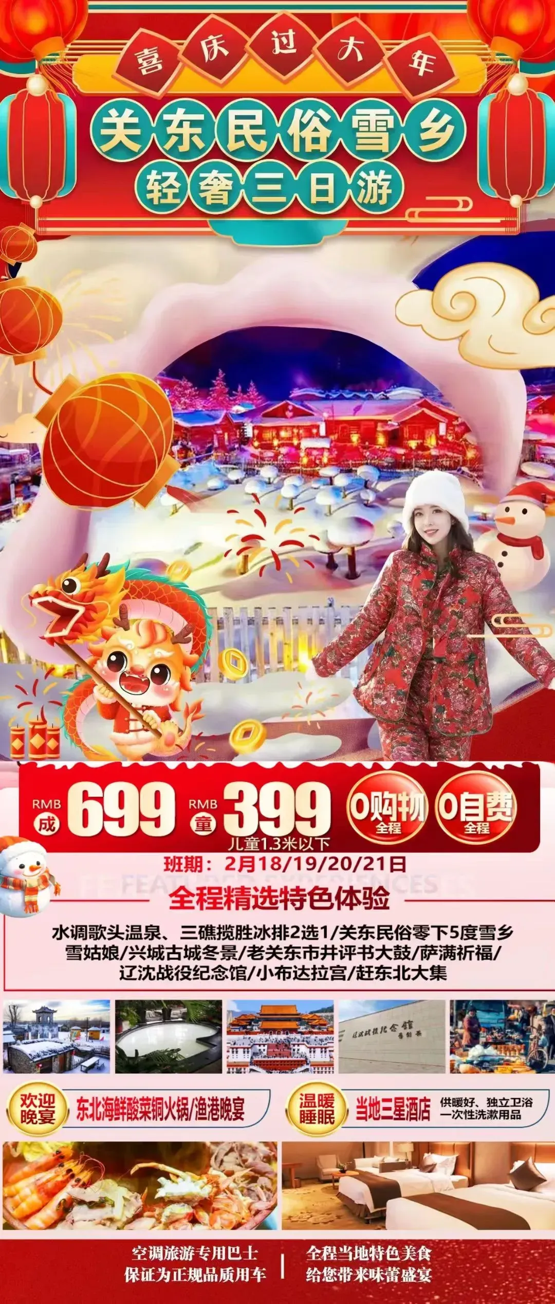 初二到初五~关东民俗雪轻奢三日游!初十~大孤山祈福三日游!初四~普陀山祈福之旅!初七~成都乐山大佛!初八~广东双乐园初八~嗨翻迪斯尼!初十~西双版纳! 初四/初五~哈尔滨+雪乡!