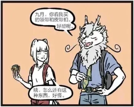 烈烈买了领带和皮带扣,戴上之后对九月说:九月,你看我买的领带和皮带扣。好酷呢!九月却很惊讶,对烈烈说:咦,怎么还有这种东西,好怪。哪咤也买了纪念品,对他们说:我买了耳坠,晚上还可以发出夜光。九月听完觉得哪咤更奇怪。