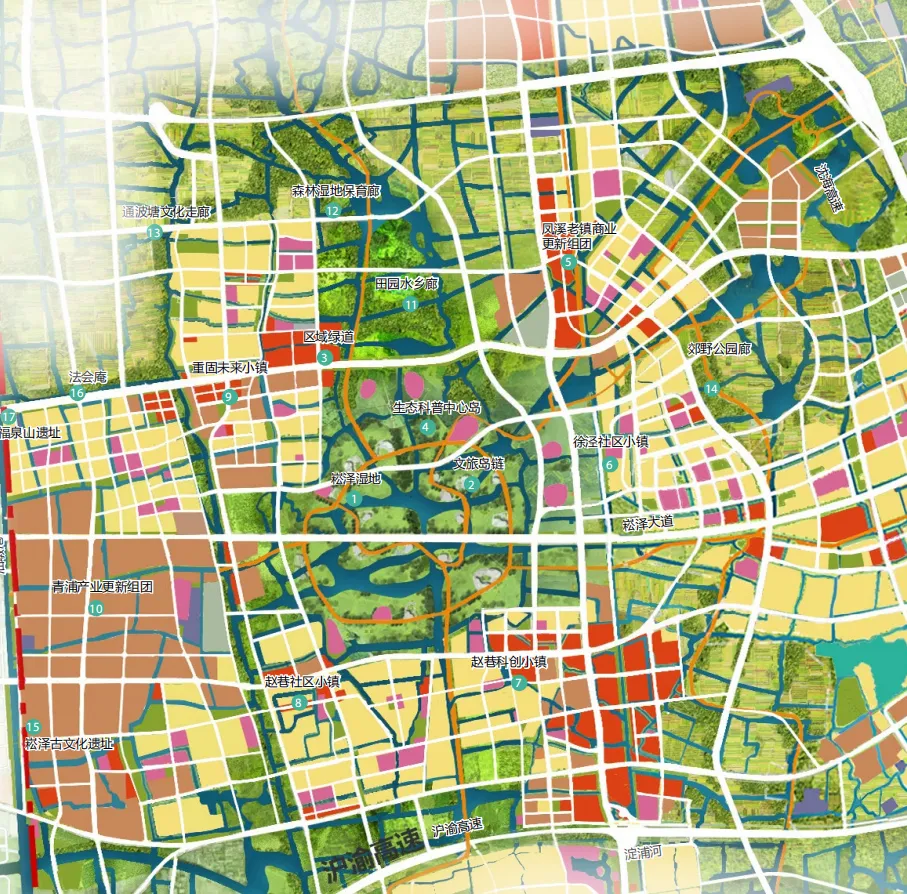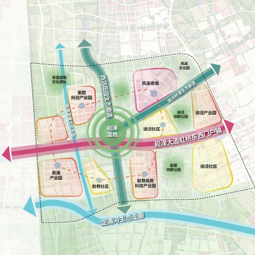 一环主要指田园小镇环:凤溪老街镇、赵巷商务镇、重固科创镇、徐泾社区镇组成田园小镇环,水系生态廊道分隔、共同环绕湿地绿心。