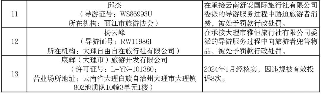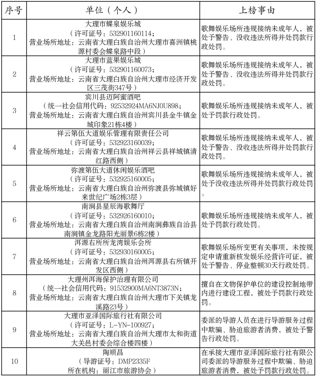 为认真贯彻落实《云南省人民政府关于印发云南省旅游市场秩序整治工作措施的通知》(云政发〔2017〕19号)和《云南省加强旅游市场秩序整治若干工作措施》等文件精神,按照省、州旅游市场秩序整治工作要求,将诚信守法的涉文、涉旅企业和有关从业人员纳入红榜,予以通报表扬;将违反文化、旅游相关法律法规,受到行政处罚的涉文、涉旅企业和有关从业人员纳入黑榜,予以通报警戒,并纳入重点监管;被吊销业务经营许可证或从业资质的涉文、涉旅企业和有关从业人员,将列入行业禁入管理。2024年度第1期“红黑榜”公布如下,接受社会监督。