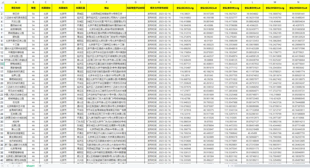 数据字段包括:景区名称、景区等级、景区所属省份、景区所属城市、景区所属区县、景区地址、景区当前等级的评定时间、相关文件发布时间、发布文件的官方网站的网址、火星坐标系经度、火星坐标系纬度、百度坐标系经度、百度坐标系纬度、wgs1984经度、wgs1984纬度