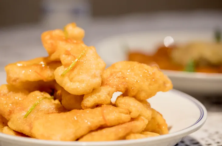 东北菜的门面,年夜饭的“硬通货”。金黄酥脆,闪着油光,夹起一块,咬下去的瞬间“咔嚓”一声。里脊肉依然柔嫩多汁,酸甜的芡汁恰到好处地裹住每一寸肌理,不抢戏,也不寡淡。配一口热腾腾的黑龙江大米饭,酥壳、肉汁、米饭在嘴里撞个满怀,是那种让人舍不得咽下的满足。