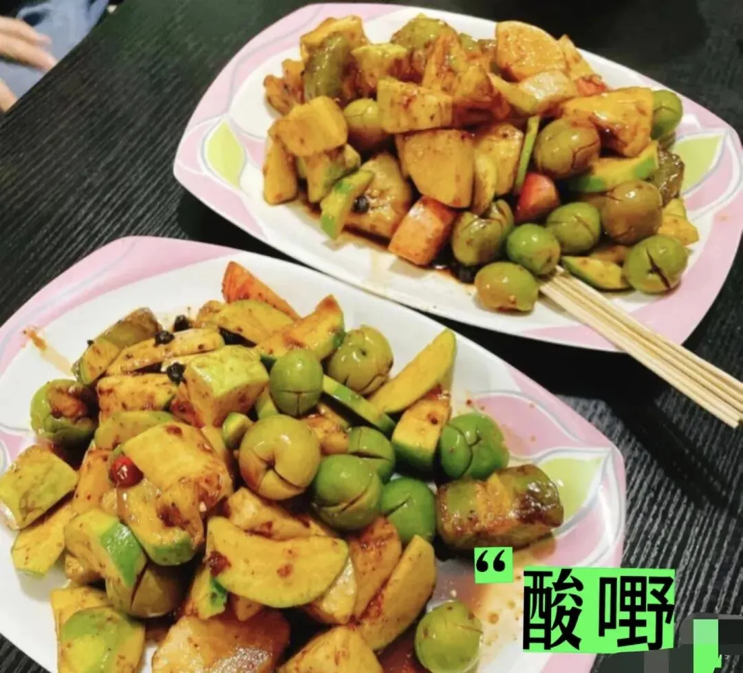 靖西酸嘢:选用当地新鲜水果和蔬菜,用辣椒粉、盐、糖和醋等调味,生津开胃,酸甜解腻。