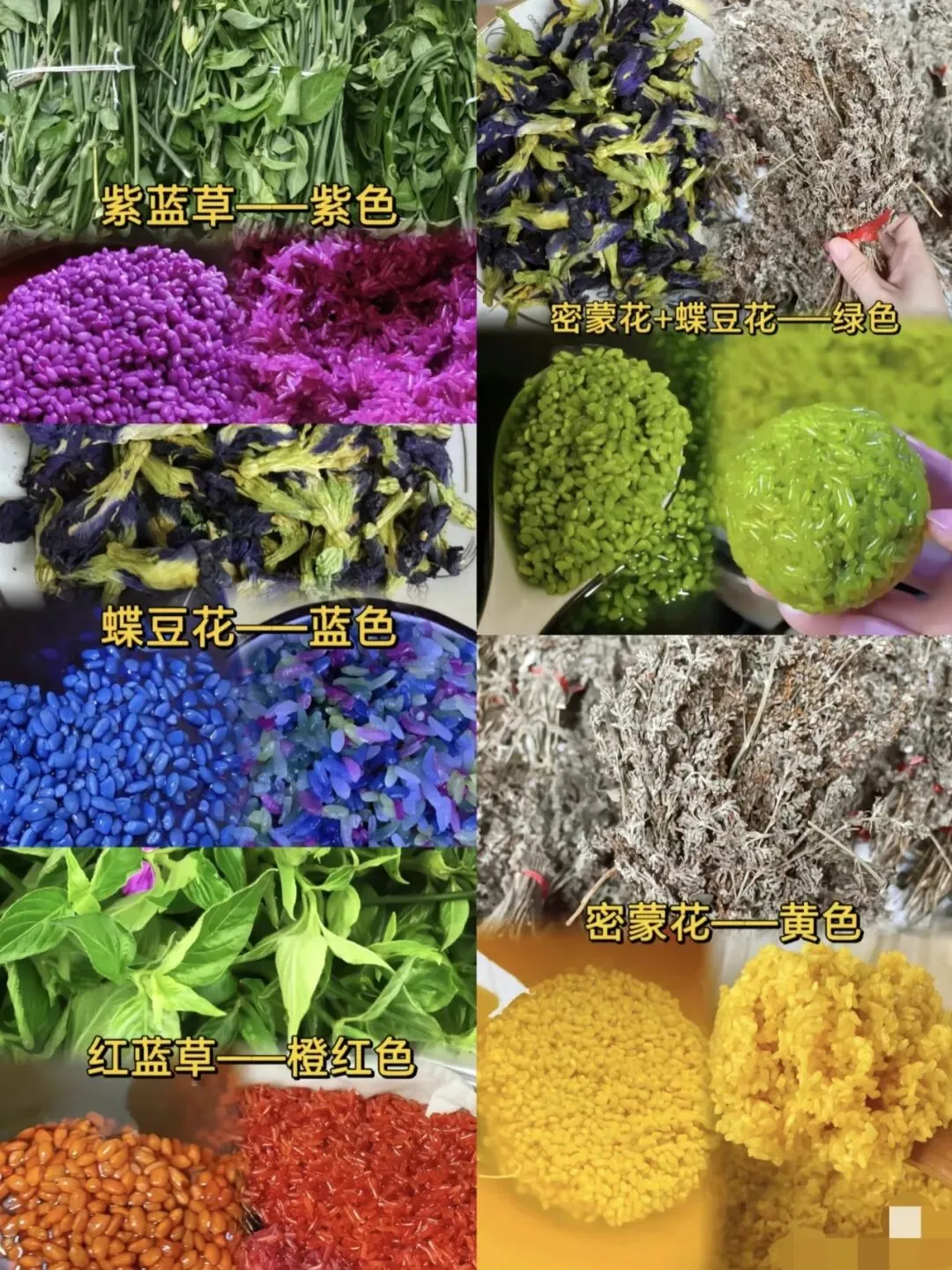 五色糯米饭:糯米搭配植物汁水制成,漂亮又营养。