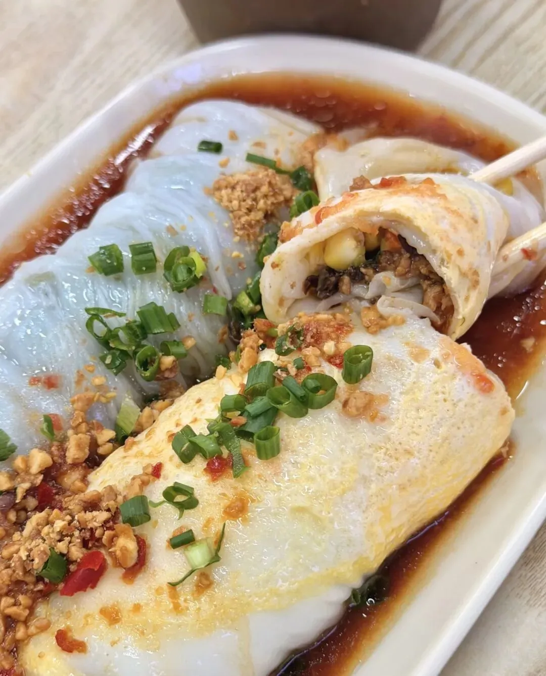 卷筒粉:豆角木耳馅裹着红糖,甜得像蜜。咸辣酱带点儿咸鲜,辣却不烧胃。配黄皮酱清清爽爽,酸甜中带果香。