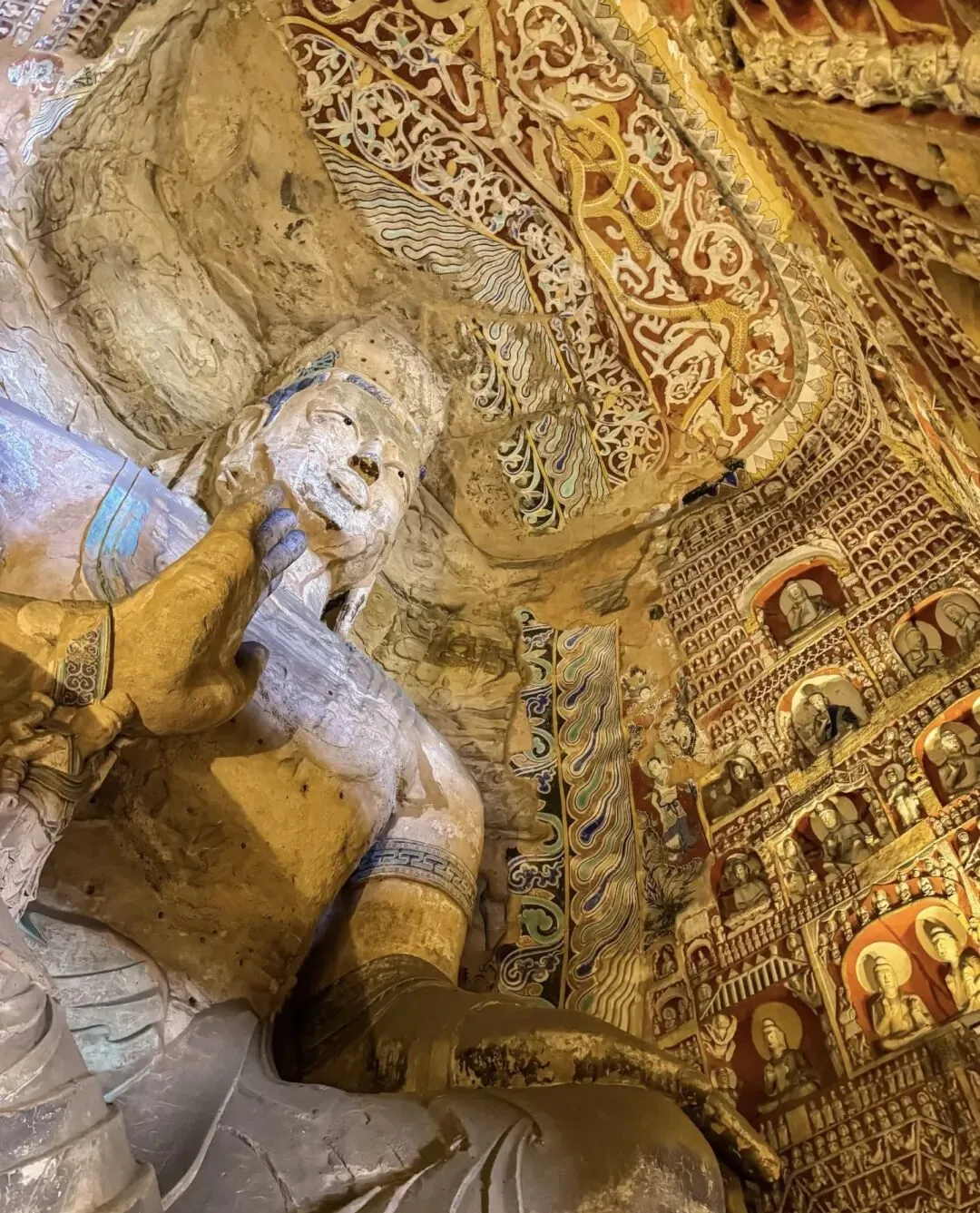 云冈石窟:天花板浮雕如梦如幻,17米高大佛眼神慈祥,站在台阶下仰拍,满眼都是震撼。