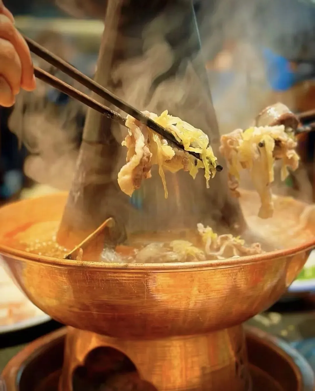 铜火锅:铜锅导热快、锅中泉水沸腾,一片鲜羊肉只需几秒就熟,一口咬下去,鲜嫩多汁、幸福感满满。