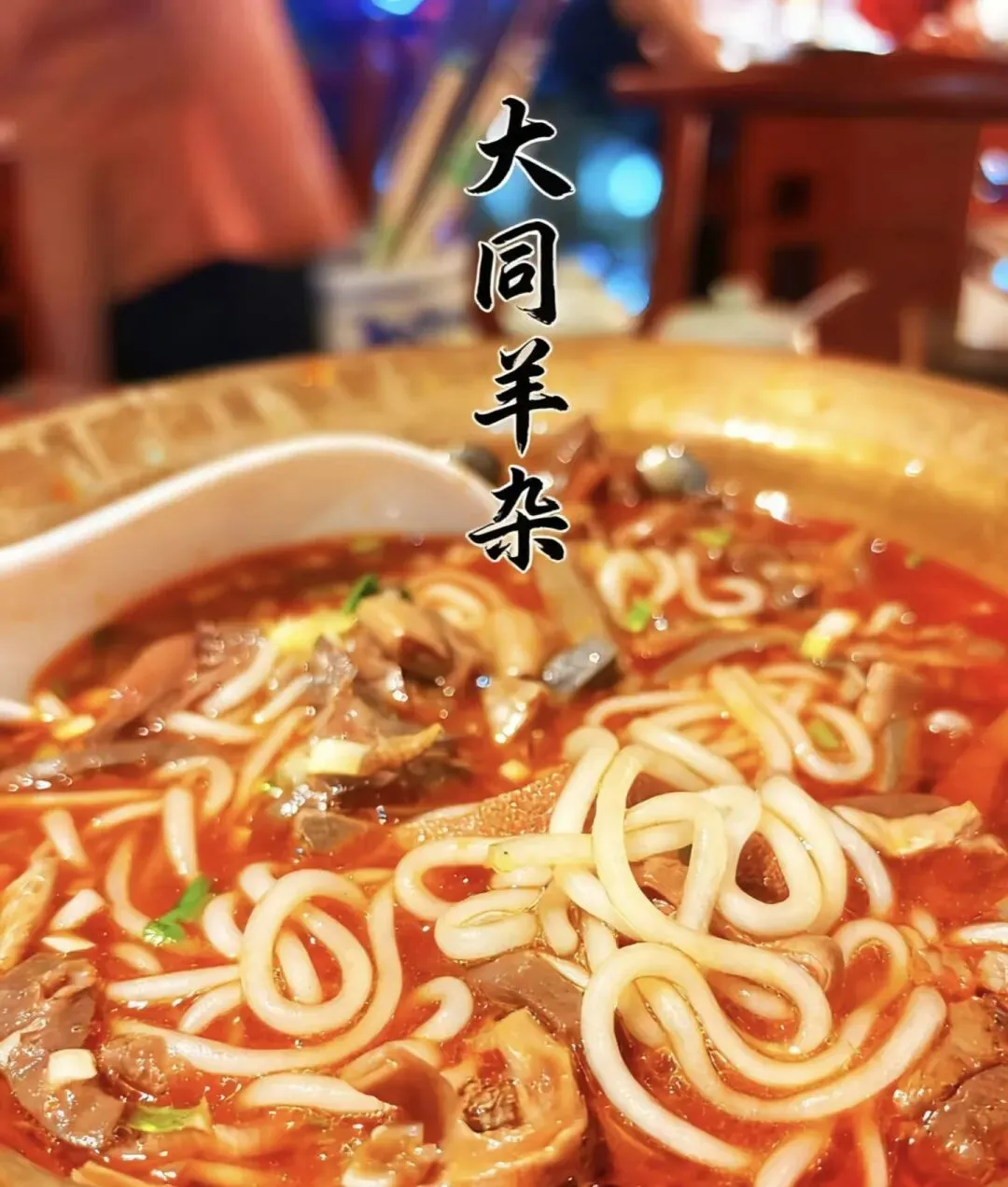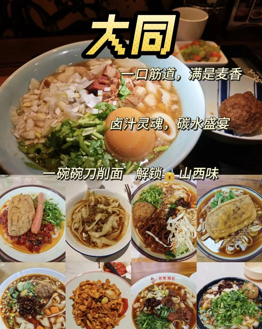大同刀削面:师傅用刀直接在面团上削出来的,面条劲道,配上豆皮、青椒、把子肉、卤蛋,满满一大碗。