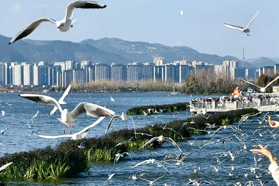 观赏郁金香和红嘴鸥、乘船漫游水上森林、体验捞鱼捞虾、傍晚至观景台或沙滩,打卡滇池日落。