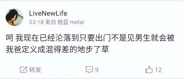 2017年3月18日,危秋洁在微博吐槽,呵,我现在已经沦落到只要出门,不是见男生,就被我爸定义混差的地步了草。