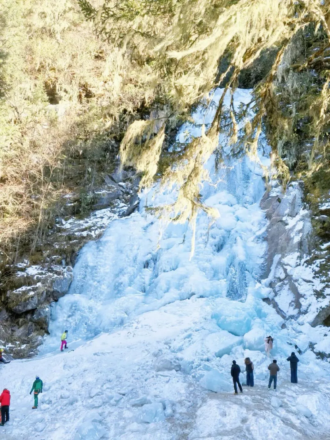 结冰的瀑布晶莹剔透,像被大自然冻住的银河。就算大二普没赶上雪,这里冬天也基本保持冰封状态,不会融化,冰挂层层叠叠,拍照自带清冷滤镜,出片率超高。