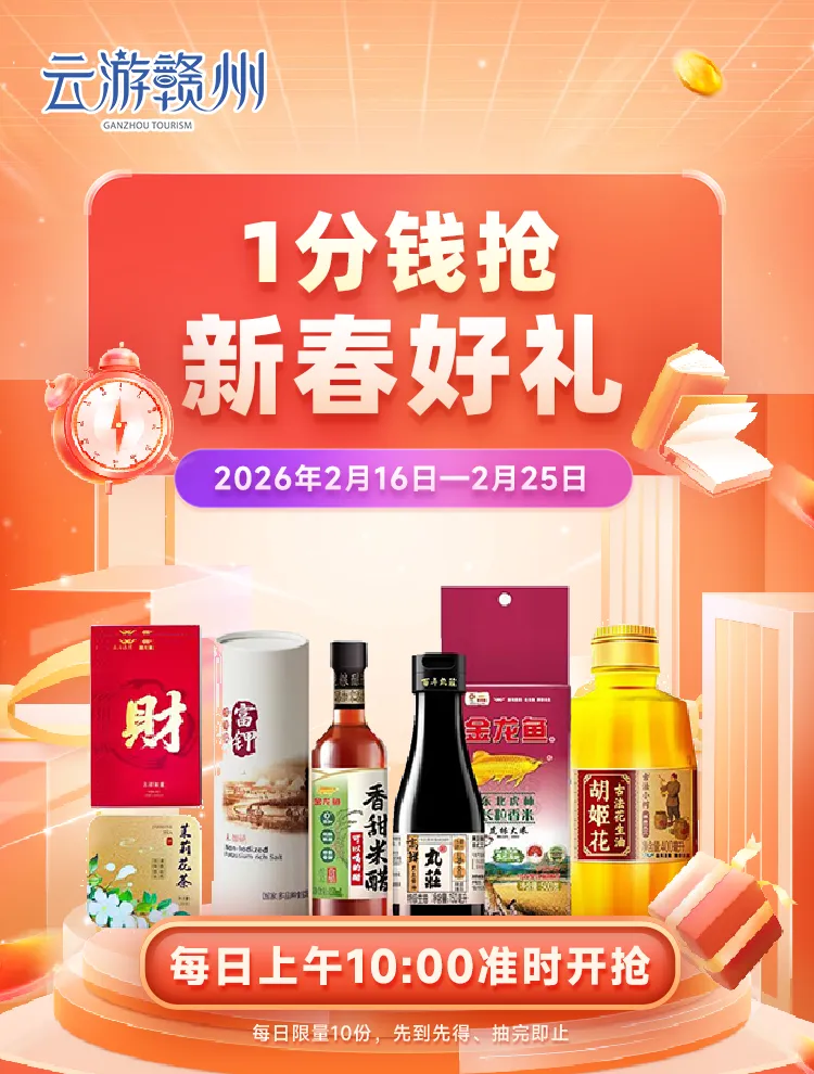 点击海报查看活动详情 1.参与渠道:登录「云游赣州」小程序,进入活动专属页面即可参与,勿信非官方链接; 2.抢购规则:每日10点准点开抢,限量10份、抢完即止,同一用户当日仅可参与1次; 3.信息填写:中奖后需准确填写收件信息(姓名、电话、地址),信息有误或无法收货,视为自动放弃福利,不予补发; 4.发货说明:所有中奖礼品,3月5日后统一邮寄,物流进度将同步,敬请耐心等待。