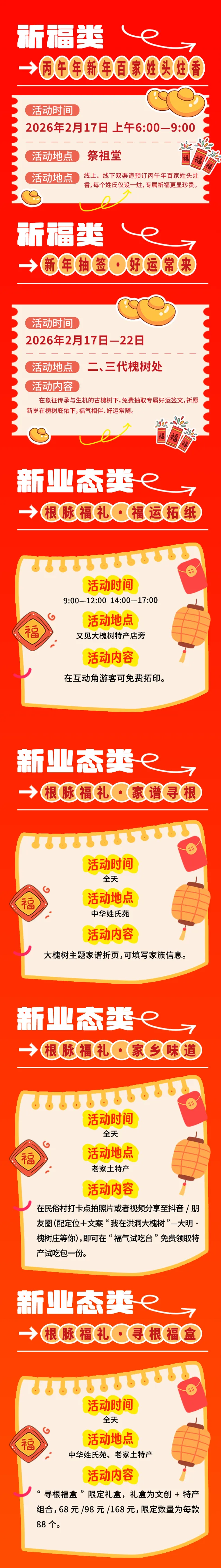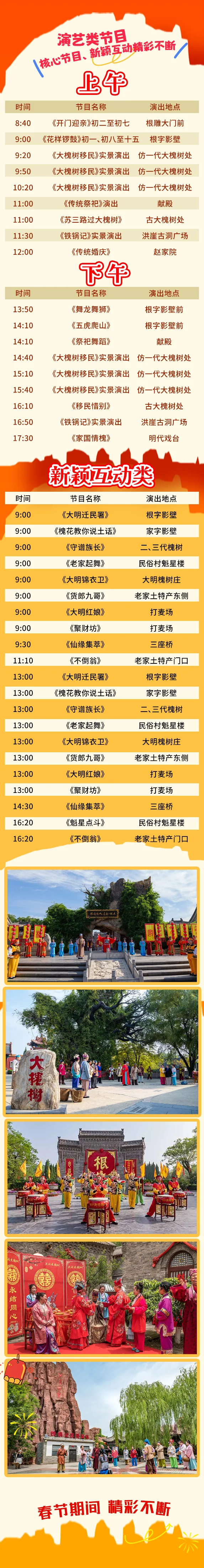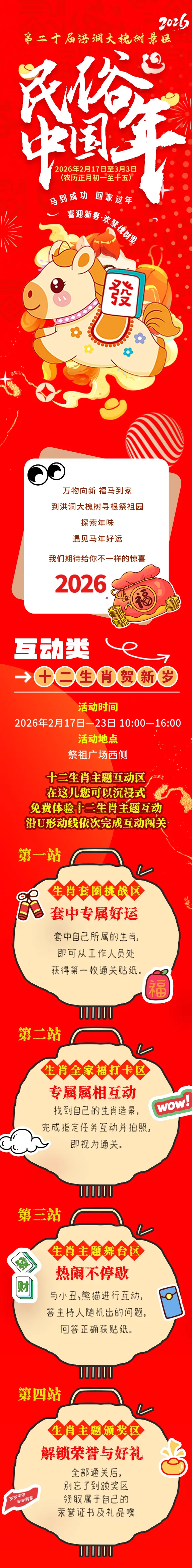 第二十届洪洞大槐树民俗中国年主题活动与槐树里商业街区2026年春节主题活动从2月17日农历大年初一开始,持续至3月3日农历正月十五。活动以互动、祈福、新业态、演艺等形式展现在游客面前,其中民俗中国年主题活动内容包括“十二生肖贺新岁”“丙午年新年百家姓头炷香”“新年抽签·好运常来”“根脉福礼·福运拓纸”“根脉福礼·家谱寻根”“根脉福礼·家乡味道”“根脉为魂·年俗为韵”“根脉福礼·寻根福盒”等,更有《开门迎亲》《大槐树移民》实景演出、《传统祭祀》《苏三路过大槐树》《铁锅记》《家国情槐》等传统表演及《大明迁民署》《槐花教你说土话》《守谱族长》等互动表演;槐树里商业街区主题活动内容包括“沉浸式街区巡游”“槐光夜宴主题灯会”“新春主题夜场”等,其中NPC游街互动与非遗表演轮番上演,精准定位游客新年游玩需求。
