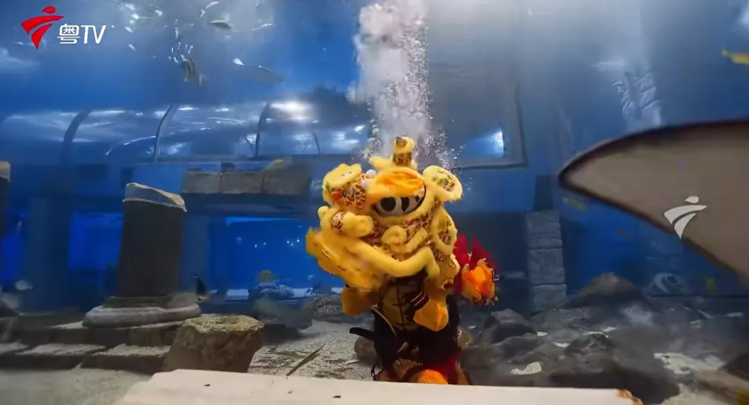 但进去之后呢,能看到水下大秀。 比如在水底下舞狮子啊,水底下英歌舞啊,这些外面都看不到,却特别有意思!