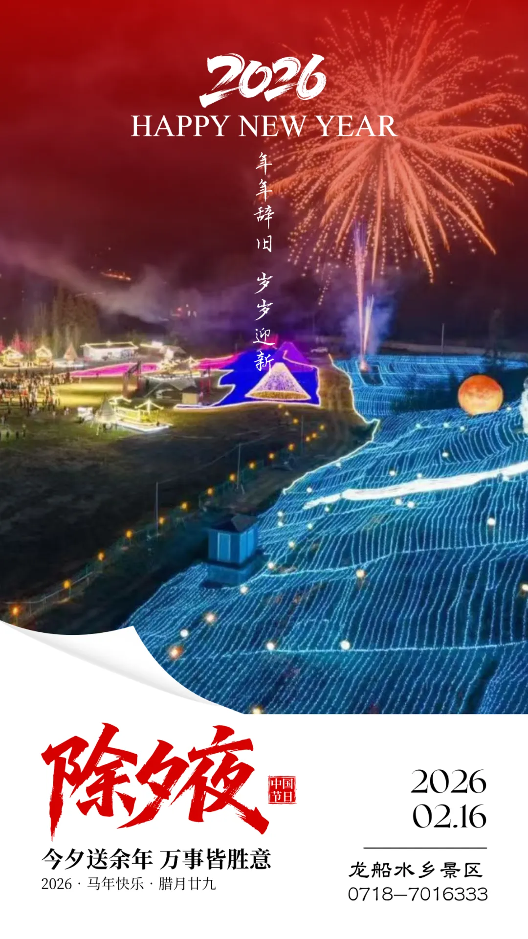 您现在的位置是:首页 > 国内旅游目的推荐 > 正文 国内旅游目的推荐 看旧年去,等新岁来 | 龙船水乡景区愿您喜乐依旧,岁岁安康! admin2026年02月16日 10:27:14国内旅游目的推荐12 看旧年去,等新岁来 | 龙船水乡景区愿您喜乐依旧,岁岁安康!辞旧迎新 恭贺新春CHINESE NEW YEAR除夕到,新春到,祝福到!在这辞旧迎新的日子里龙船水乡景区向一直以来默默支持景区成长的游客及各界友人致以新春的祝福!祝各位在新的一年里身体健康,万事如意,马年大吉!2026年愿岁月温柔以待,生活充满阳光春暖花开时 期待您的光临编辑:冯钰淇审核:李斯琪签发:张 接 转载请说明来源于"旅荐网",部分内容转载自网络,如有侵权请联系qlwl@foxmail.com删除 本文地址:https://www.15386.cn/post/109712.html 上一篇 旅游胜地德国给您拜年啦! 下一篇 中镇霍山七里峪景区全体员工,祝大家马行大运,福气连年! 相关文章 宝鸡凤翔东湖周边免费景点!五一省钱攻略 【天津72小时旅游攻略|经典Citywalk路线+春风十里 天津等你,赏花攻略来了!】 2026.4月潮汕旅游攻略:第一次去潮汕,有这篇攻略就够了!(美食游玩攻略,纯干货)! 旅游攻略 | 浙江衢州:必打卡景点+美食全推荐!一座被严重低估的宝藏小城! 山东烟台旅游攻略 广西7天经典旅游攻略 一个人的旅行,从这6个地方开始,不用攻略,随便挑一个出发!! ️五一出逃 遇见美好 国内汽车版出游计划 福建厦门6天5晚自由行攻略 江西免费山水古村大合集!按季节规划行程,一篇吃透赣地风光 发表评论 取消回复 评论列表 这篇文章还没有收到评论,赶紧来抢沙发吧~