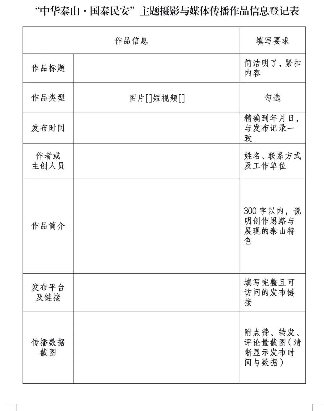 参与者报名需提交作品信息登记表、作品文件包、作者承诺书,缺一不可。其中,作品文件包要求为:图片作品放入文件夹,命名为“作品标题+作者姓名”;短视频作品直接命名为“作品标题+作者姓名”,无水印、画质清晰;可以同时提报作者职业证明材料,如摄影师(摄影师证件)、媒体记者(记者证或单位证明)、主播达人(账号主页截图,含粉丝量、账号名称等)。作者承诺书需手写签名后扫描或拍照提交,承诺内容为:作品为原创无版权纠纷;同意主办方无偿使用获奖作品用于泰山宣传;所提供信息真实有效。