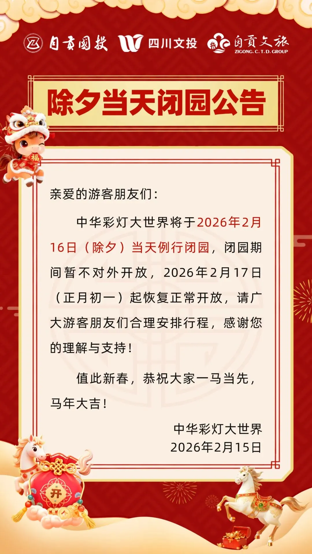 您现在的位置是:首页 > 国内旅游目的推荐 > 正文 国内旅游目的推荐 自贡重要景点今天(除夕)闭园公告 admin2026年02月16日 11:00:03国内旅游目的推荐1 自贡重要景点今天(除夕)闭园公告来源:自贡文旅推荐新闻内脏被偷换?自贡商户发出质问:我们的利益谁来维护?自贡最新人事动态!这“货”已致我市12人紧急送医!这种“躺平”会要命 转载请说明来源于"旅荐网",部分内容转载自网络,如有侵权请联系qlwl@foxmail.com删除 本文地址:https://www.15386.cn/post/109765.html 上一篇 馬年啟新程!澳門旅遊大學恭祝新春快樂 下一篇 旅游记 相关文章 旅游记 迎新春 贺新年丨皖美生活数字旅游年卡祝您马年大吉,福气满门来! 馬年啟新程!澳門旅遊大學恭祝新春快樂 2026退役军人在普洱交通出行、旅游景点、酒店住宿、生活服务优待 刘小明在主持春节假期旅游市场视频调度会议 辽阳市文化旅游和广播电视局马年新春贺词 华南理工大学旅游管理系恭祝全体师生、校友及各界朋友新春快乐! 注意!今天自贡这些景点闭园! 仙岩风景名胜区祝广大市民新春快乐,马年大吉! 中国旅游协会妇女旅游专业委员会祝大家阖家安康,万事顺意! 发表评论 取消回复 评论列表 这篇文章还没有收到评论,赶紧来抢沙发吧~