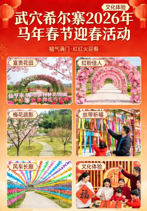 诗意新春,花开富贵:1. 迎春花海: “富贵花田”仙客来盛放,寓意福气满门。 2. 诗意布景: “红粉佳人”花廊、梅花疏影、祈福墙、风车长廊,步步入画。 3. 团圆年味: 新春主题装饰,红火氛围拉满。 4. 文化体验: 亲手写福字、挂祈福丝带,体验传统年俗。