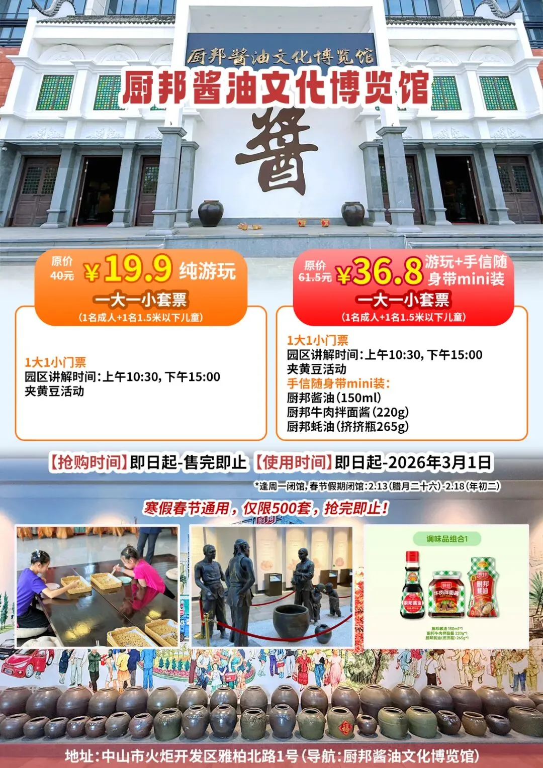 地址:中山市火炬开发区雅柏北路1号(导航:厨邦酱油文化博览馆)