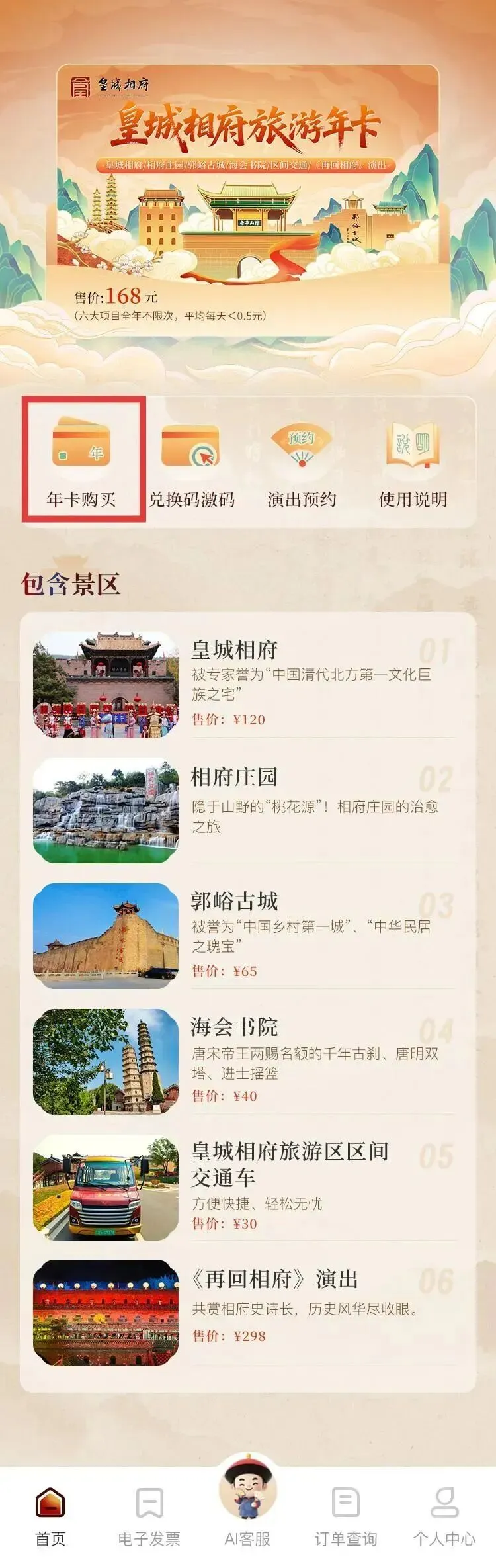 找到【本地年卡 / 皇城相府旅游年卡】入口