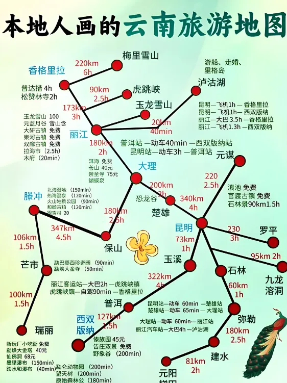 💡 滇境小贴士:昼夜温差大,备薄厚外套;紫外线强,做好防晒补水;尊重民族习俗,不随意拍摄同胞;品美食多问本地人,避开宰客门店。