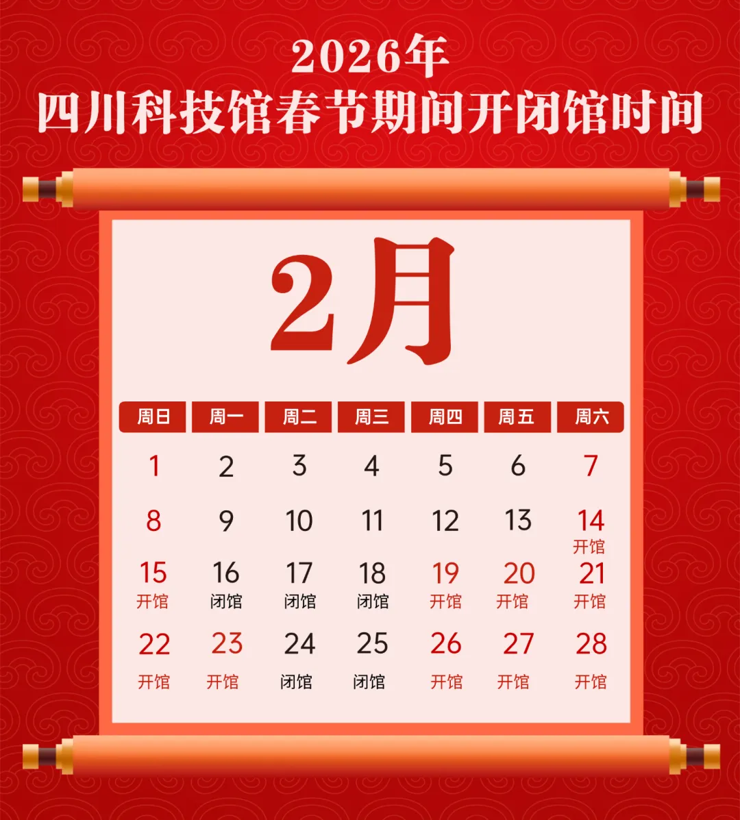 为满足广大观众春节期间参观需求,保障参观秩序与安全,现将四川科技馆2026年春节假期开放时间安排公告如下: