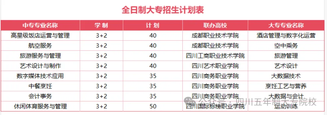 五年一贯制大专班是与成都职业技要学院、四川工商职业技术学院、四川艺术职业学院、四川商务职业学院、四川国际榜职业学院联合办学,前三年是本科完成中职阶段学校,后两年进入指定的大学,完成后两年学业。