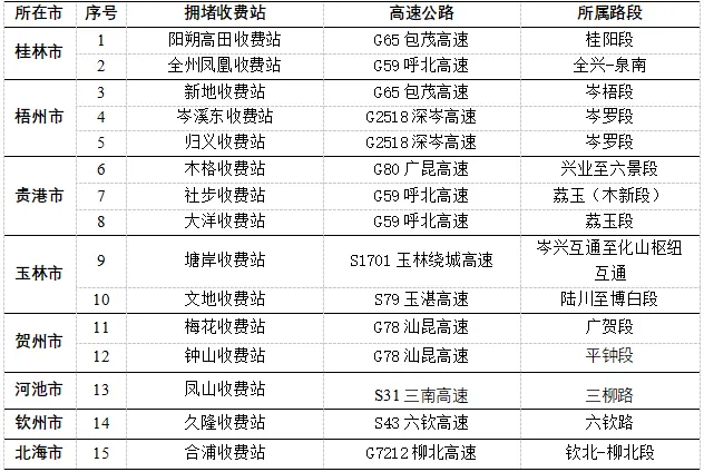 根据《全国高速公路运行监测日报》广西收费站通报数据,预测有新地站、阳朔高田站、合浦站、岑溪东站、大洋站、归义站、梅花站、社步站、塘岸站、文地站、凤山站、久隆站、木格站、钟山站、全州凤凰站等15个收费站易发生拥堵缓行。(详见表1)