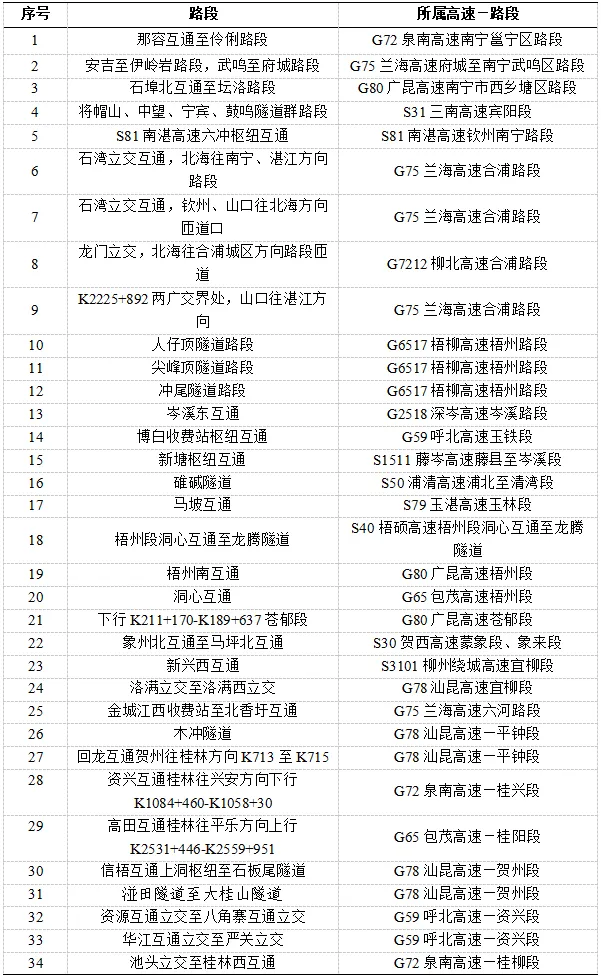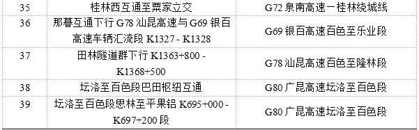 预测有G72泉南高速那容互通至伶俐路段、S40梧硕高速梧州段洞心互通至龙腾隧道等39个路段(枢纽互通)易发生拥堵缓行。(详见表2)