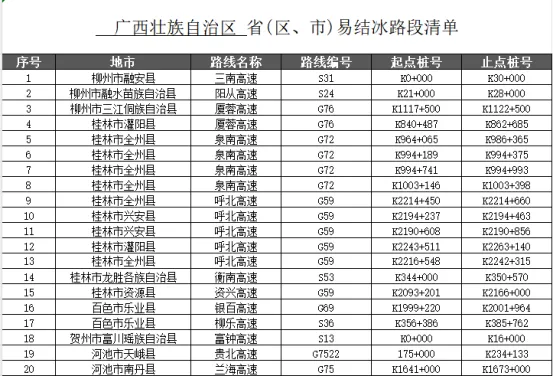 预测易结冰路段有S31三南高速K0+000至K30+000、S24阳从高速K21+000至K28+000、G76夏蓉高速K1117+500至K1122+500等20处(详见表4)。