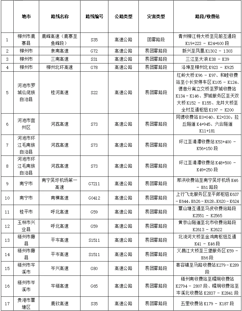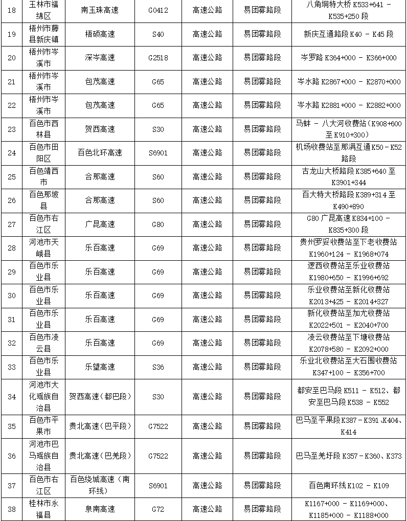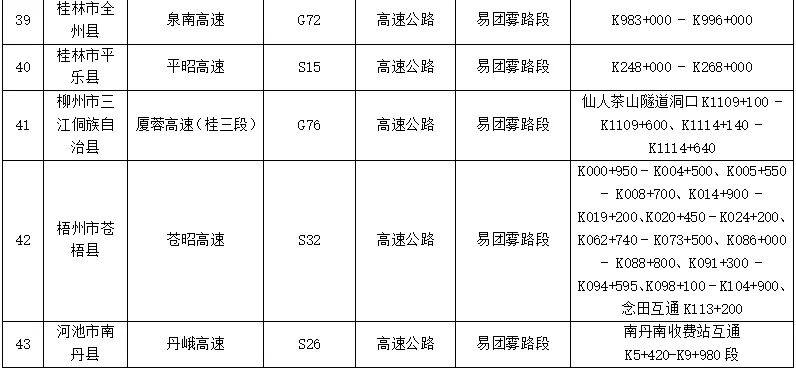预测有S26丹峨高速南丹段南丹南收费站互通K5+420-K9+980等43段易受团雾影响(详见表5)。