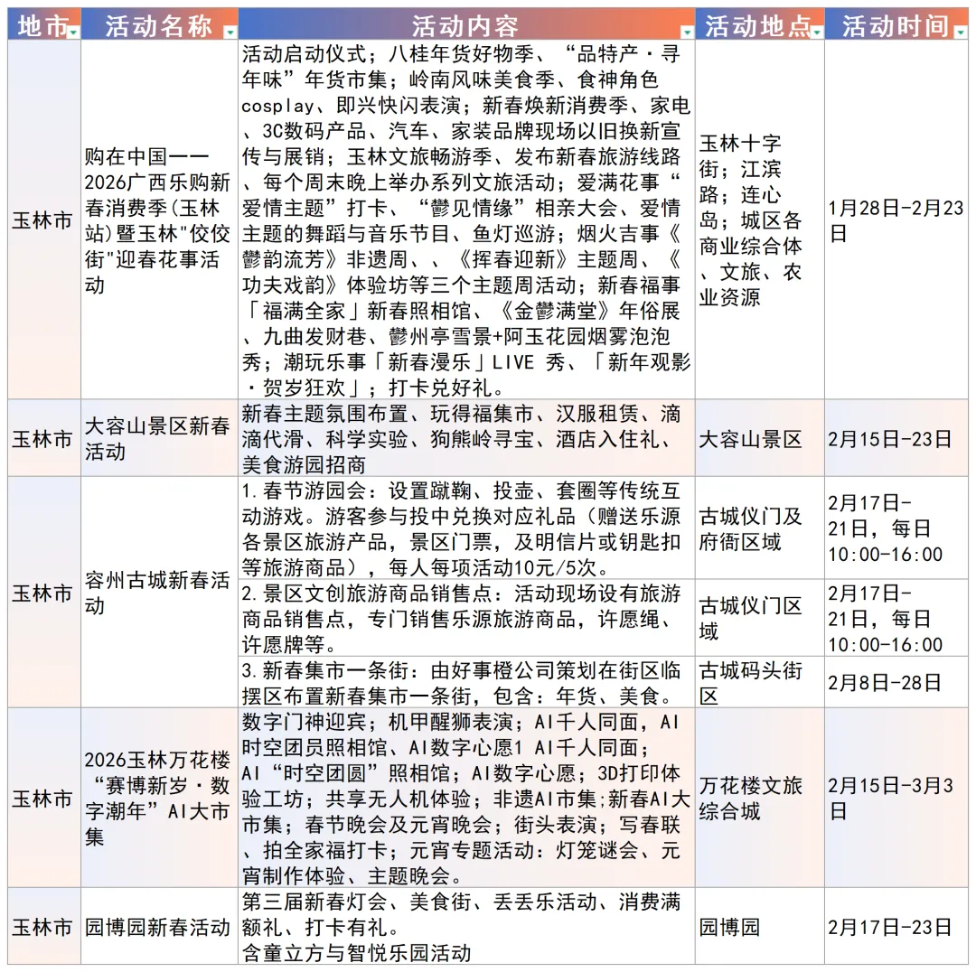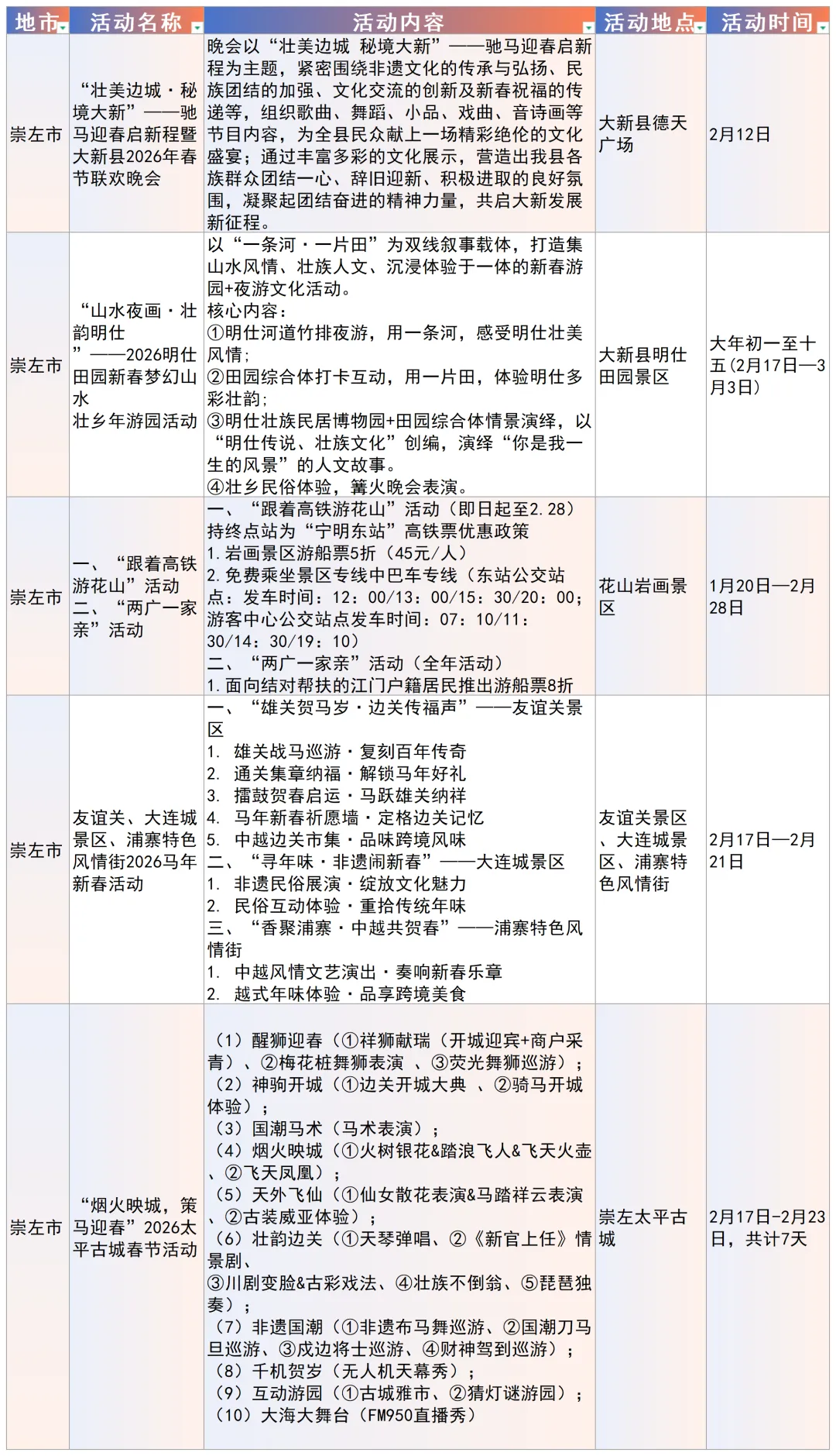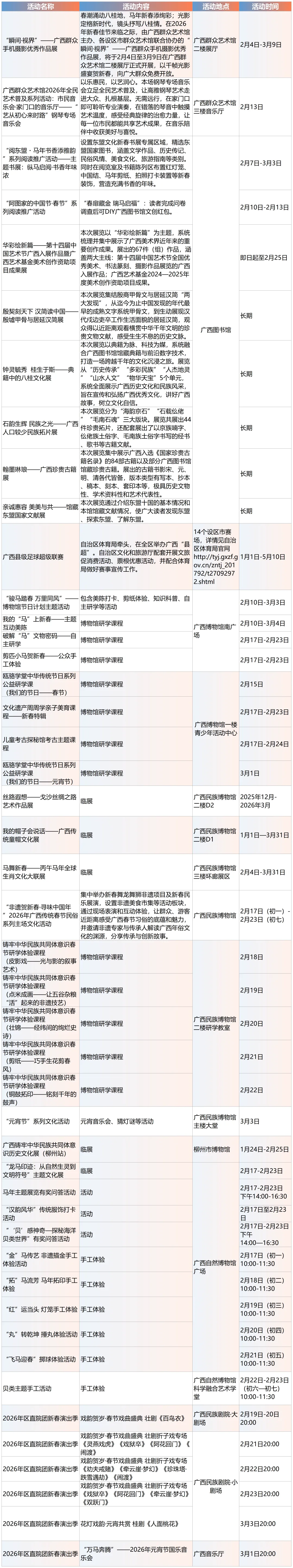 2026年春节来临之际,广西全区各地推出多项文旅活动,从都市到乡村,处处洋溢节日氛围!活动既有庙会、舞龙舞狮、戏曲等传统民俗,又有艺术展览、乐园游玩等创新体验。